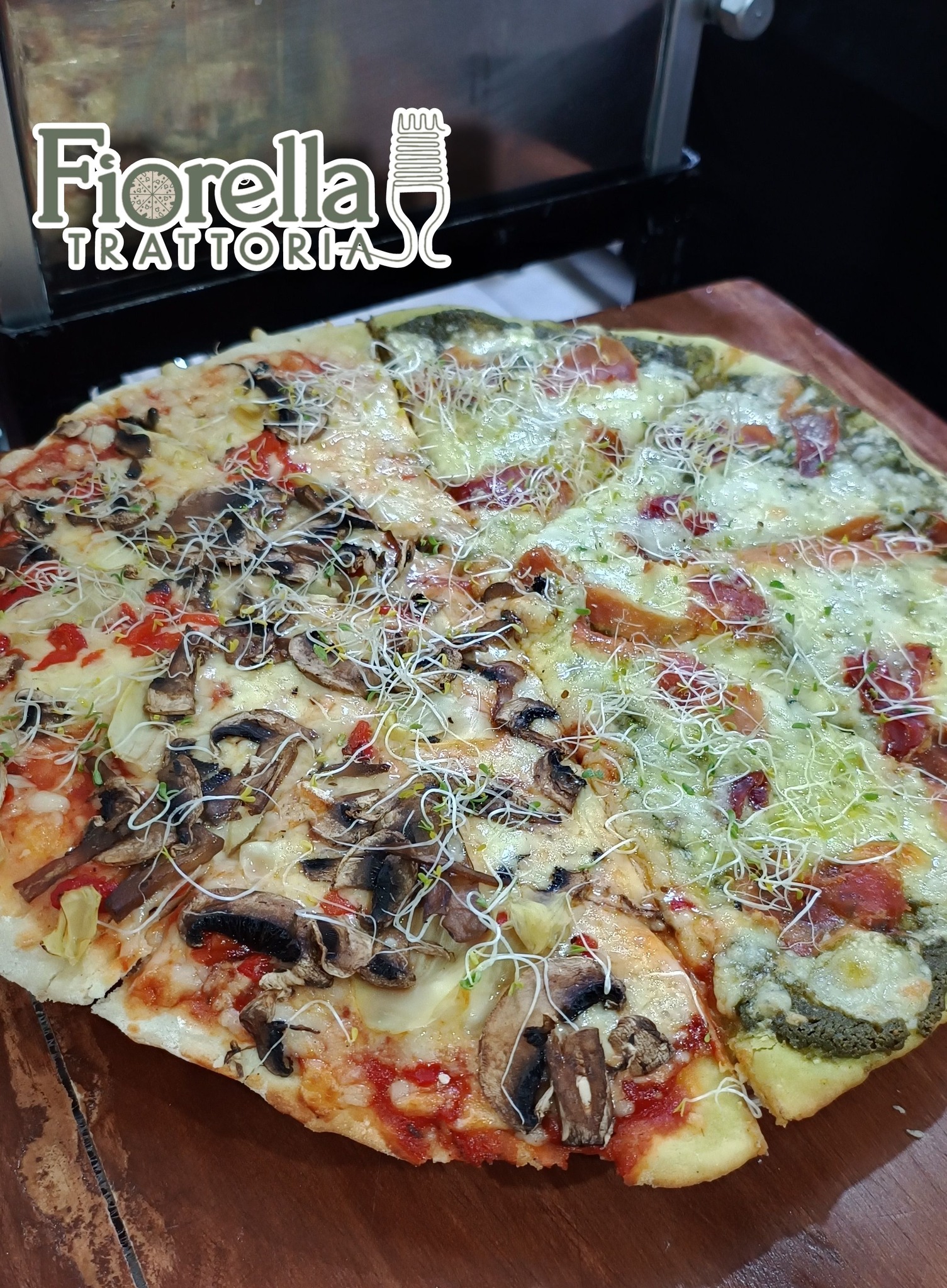 Salsa roja, cebolla, champiñones, pimiento, tomate y germen
